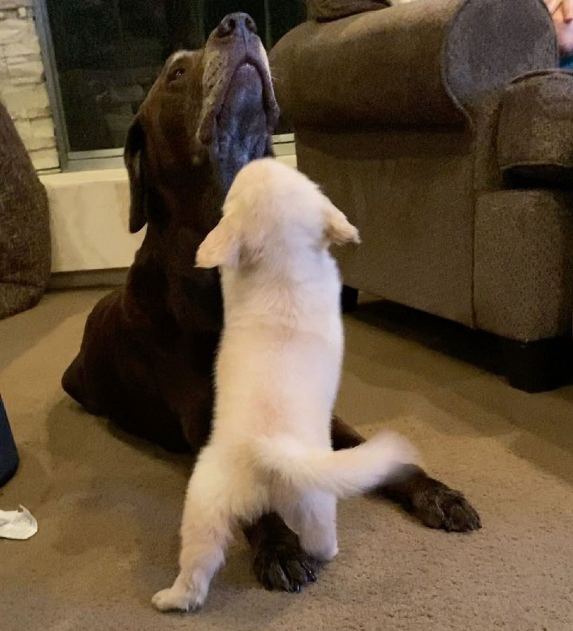 This cute golden retriever pup just wants to play, but the big grumpy doggo is not so playful - it barely reacts to the little goofball. Don’t be so annoying, little guy! Just give the old dog some personal space, please! After a little nap, the big dog will be ready to play with you - at least for five minutes.