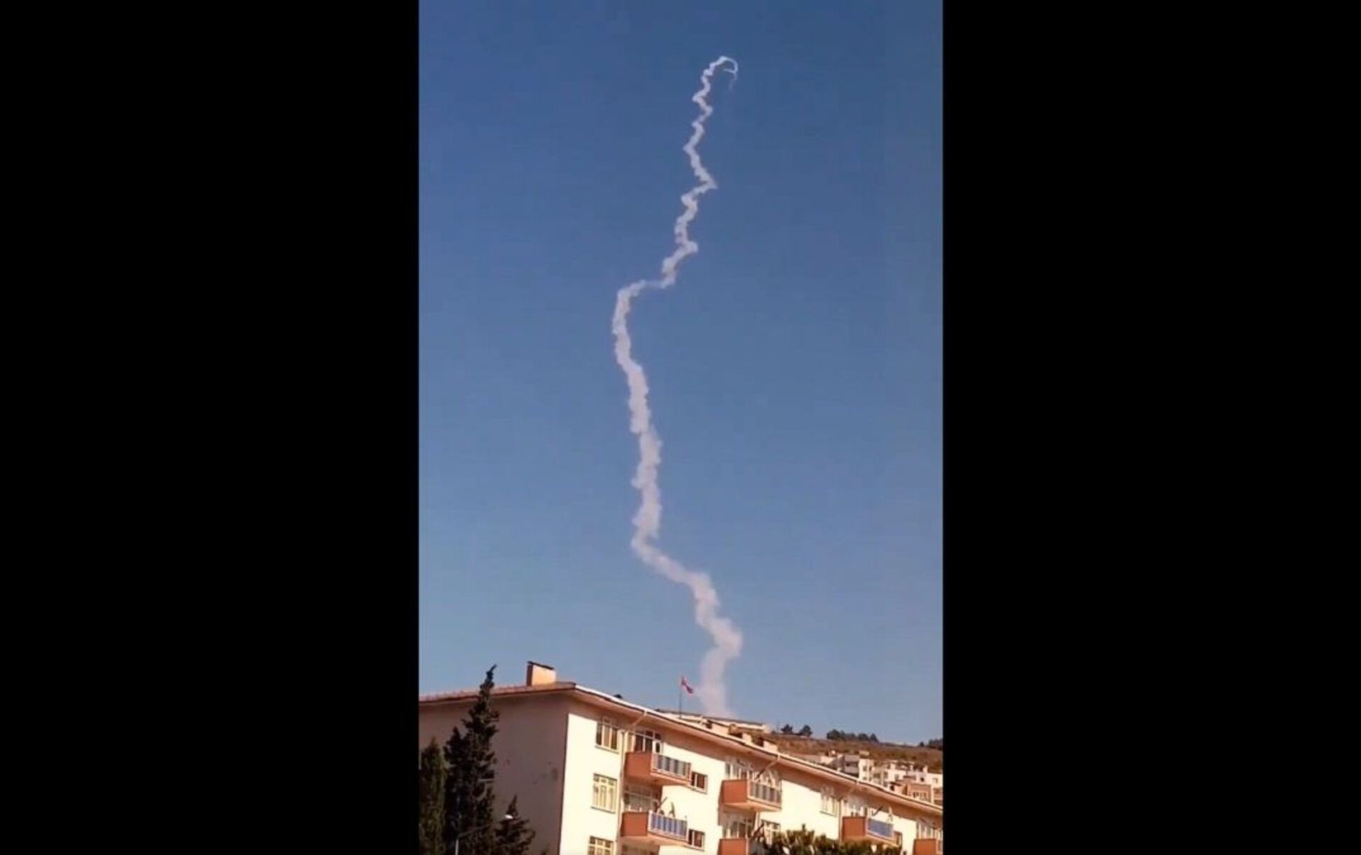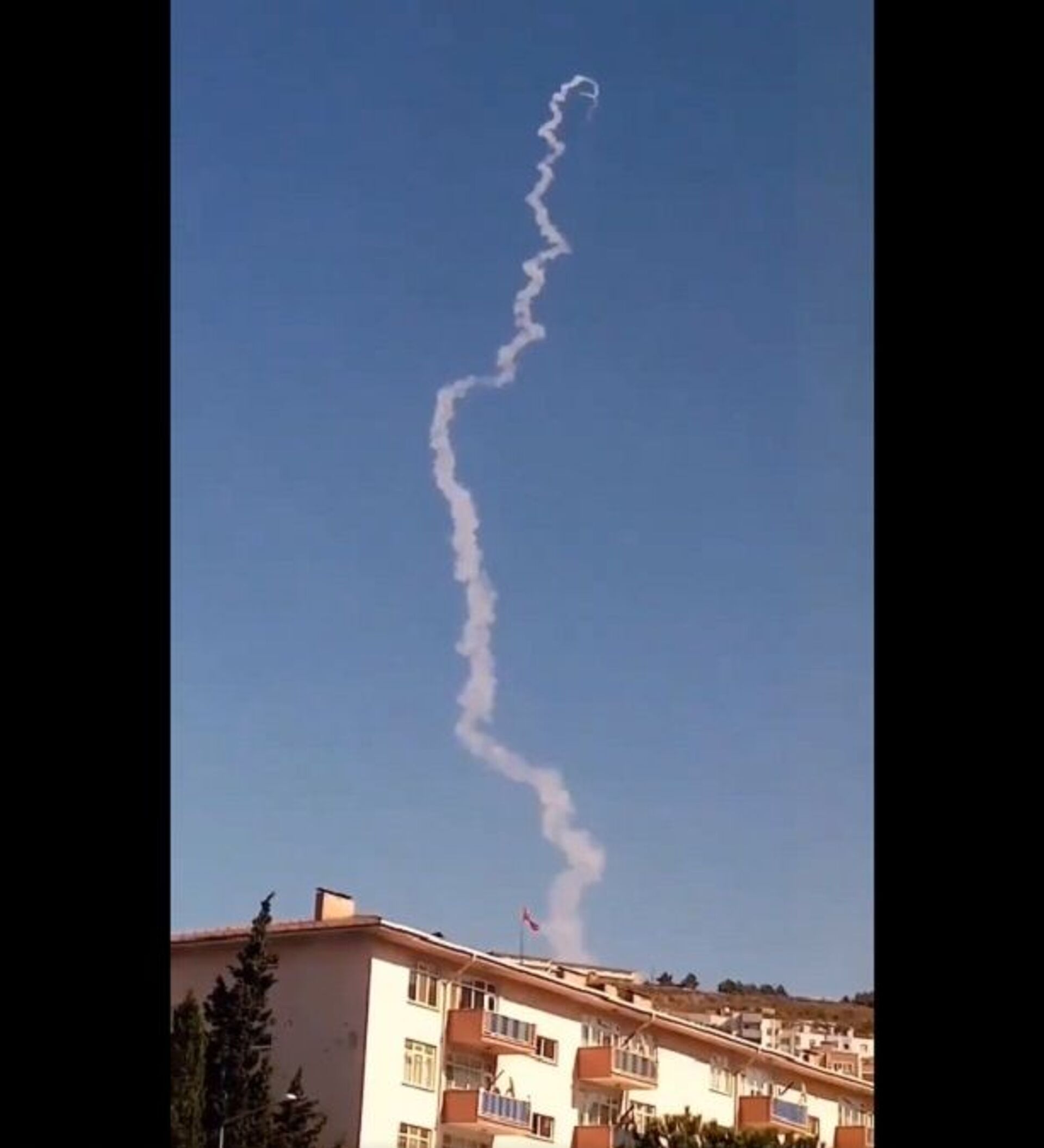 In a 10-second video clip, a zigzagging pillar of smoke is seen in the sky above a residential area of the city.