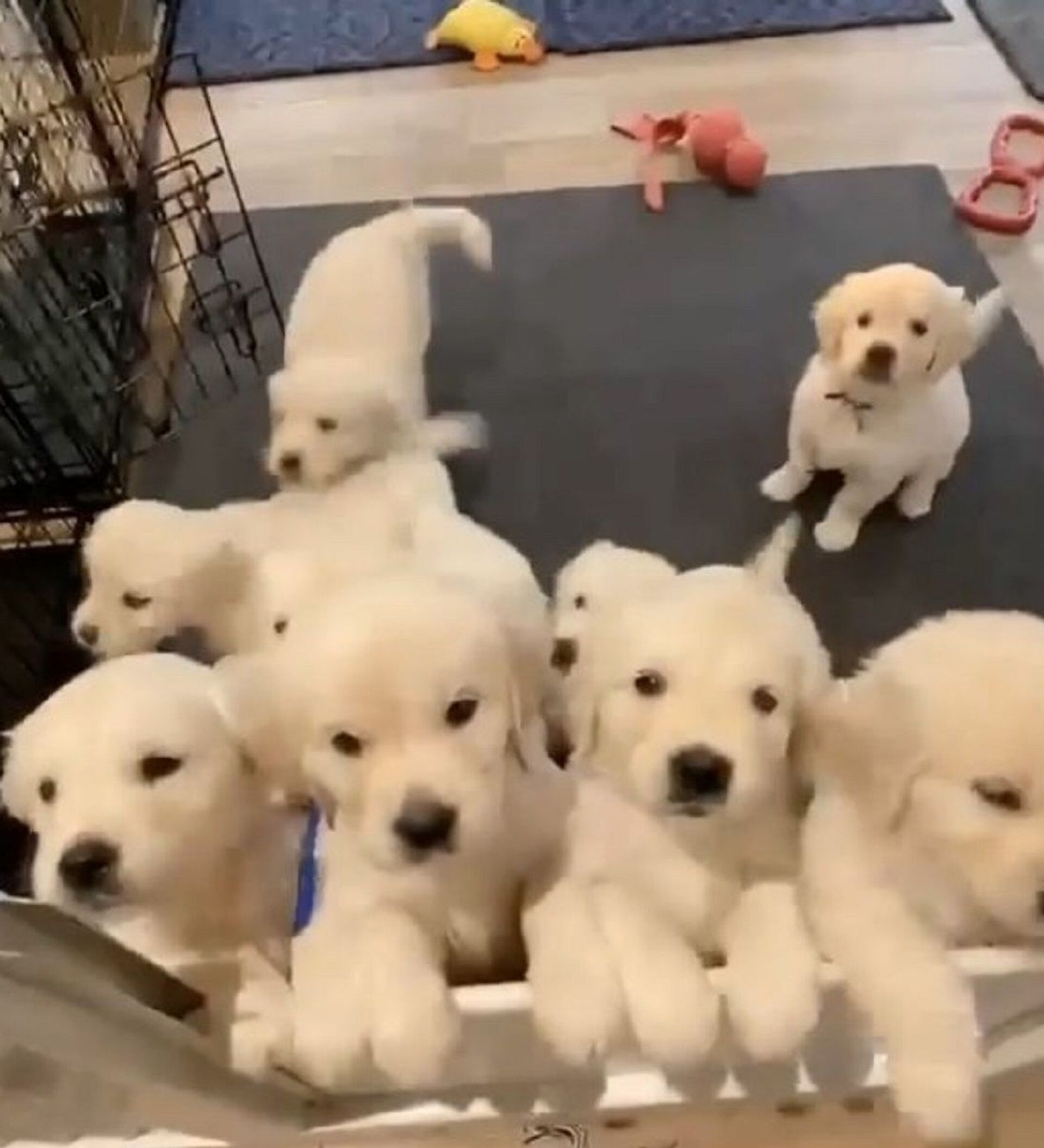 Just look at those little golden retrievers! It seems that the puppies have just woken up from their nap and are full of energy. It's a bit difficult to count them right, as the little rascals are going back and forth and are desperately trying to get out of their playground. But in the end, we can see nine adorable siblings who are eager to play with you. Unbelieveably cute!