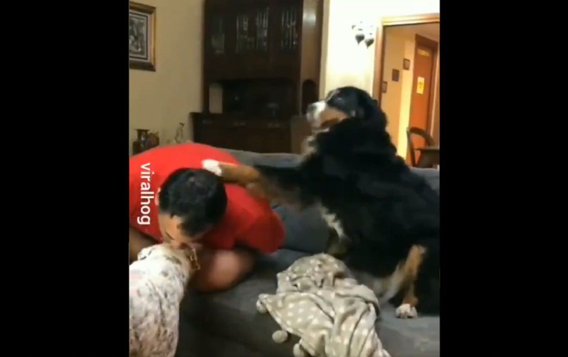 In a nine-second video clip, an adorable dog gets extremely jealous looking at its pet owner showering kisses on another dog.