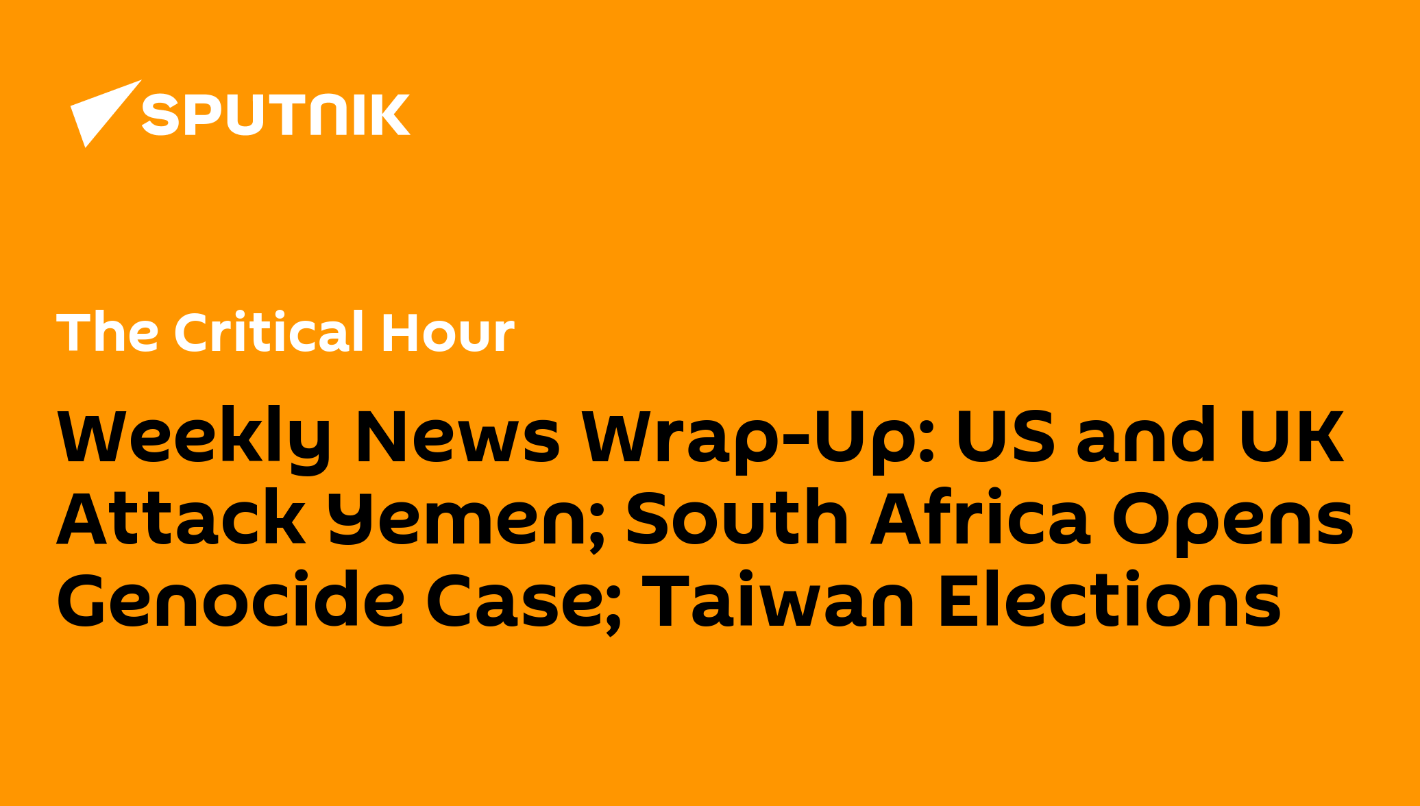Dr. Ken Hammond, writer and professor of East Asian and global history at New Mexico State University, joins us to discuss the upcoming election in Taiwan and the US’s multi-dimensional assault on China and North Korea.Laith Marouf, a broadcaster and journalist based in Beirut, Lebanon, joins us to discuss the US’s attack on Yemen and South Africa’s genocide case against Israel.Jon Jeter, journalist and author, joins us to discuss the South African genocide case and Jewish opposition to the Gaza conflict.Steve Poikonen, host of AM WakeUp & SlowNewsDay live on Rokfin & Rumble, and Jim Kavanagh, whose work can be found at Jim Kavanagh's Substack and thepolemicist.net, come together to discuss the Congressional pushback against the neocon attack on Yemen, the anti-war protest scheduled for this weekend, and the 2024 election.Erica Caines, founder of Liberation Through Reading and Editor of Hood Communist Blog, and Netfa Freeman, host of Voices With Vision on WPFW 89.3 FM, Pan-Africanist, and internationalist organizer, come together to discuss the US’s response to the South African genocide case and the fight against US imperialism in the United States.The views and opinions expressed in this program are those of the speakers and do not necessarily reflect the position of Sputnik.We'd love to get your feedback at radio@sputniknews.comCatch us in the US at 105.5FM, 104.7FM, 102.9FM, 1390AM, 1140AM